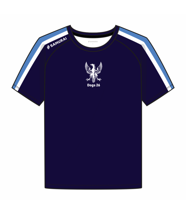 Samurai performance t-shirt featuring the school crest center chest with Dogs 26 sign off beneath. There is the option to add your initials to the front right hip.
